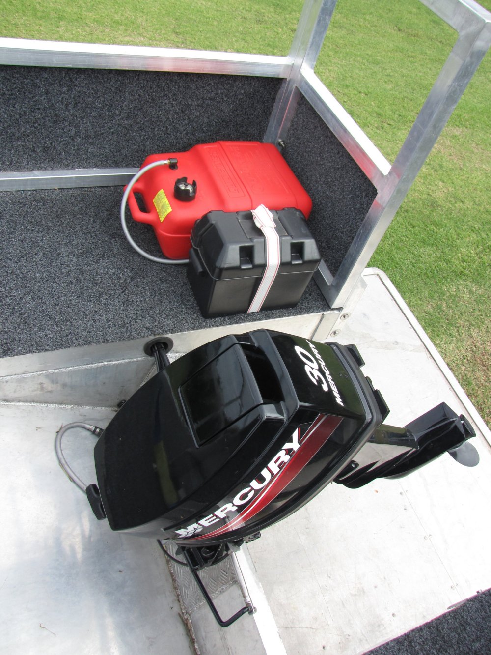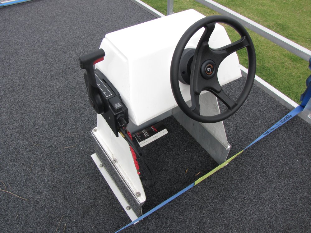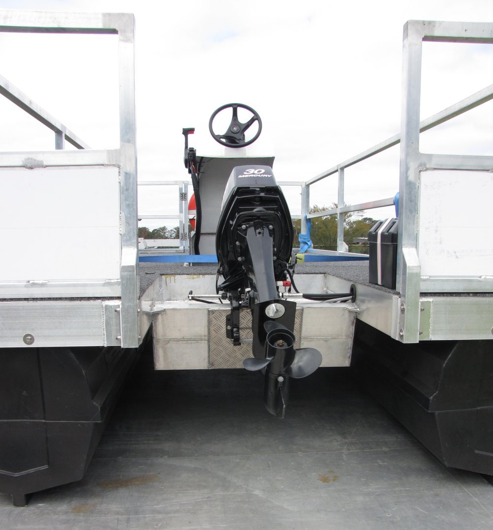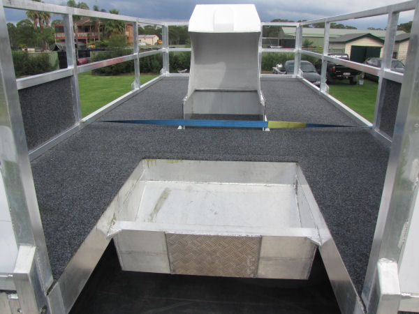Shown here with alloy access ramps, storage toolbox, motor bracket with step, handrails, and control console. This boat was made to transport quad bikes.