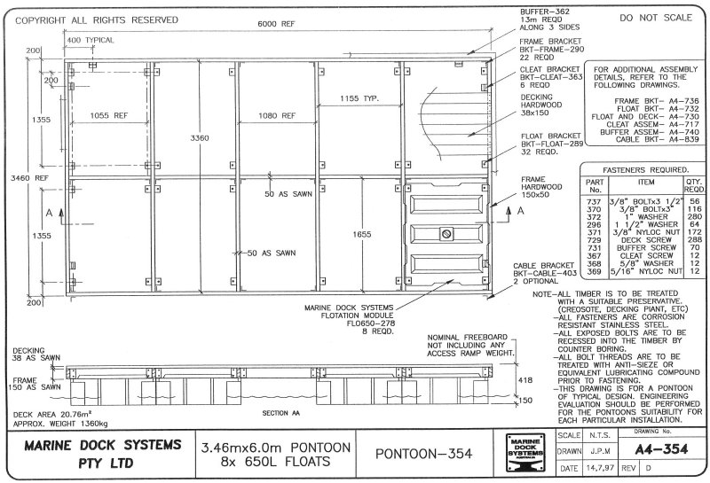 Drawing a4-0354 Pontoon 6 mtr x 3.46 (8 x 650 Litre Floats)